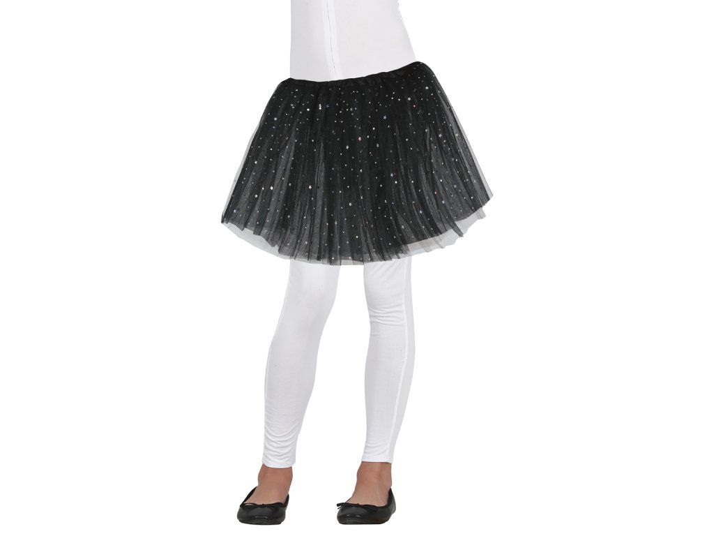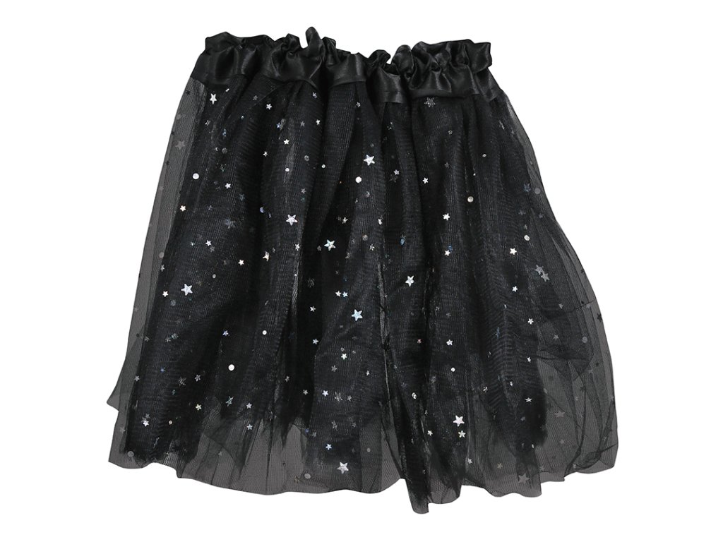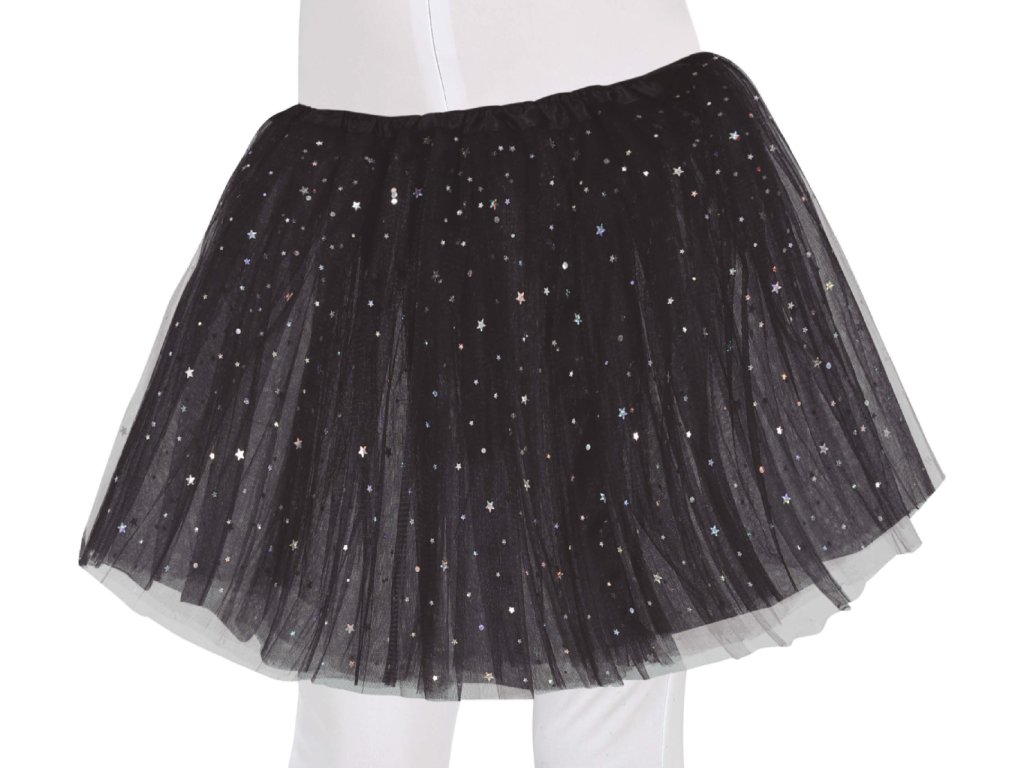 TUTU sukně v černé barvě vyrobená z tylu zdobená stříbrnými hvězdami, v pase na gumu, lehce průsvitná. Obvod pasu 50 cm (pružnost gumy 46 - 80 cm), délka sukně 30 cm.