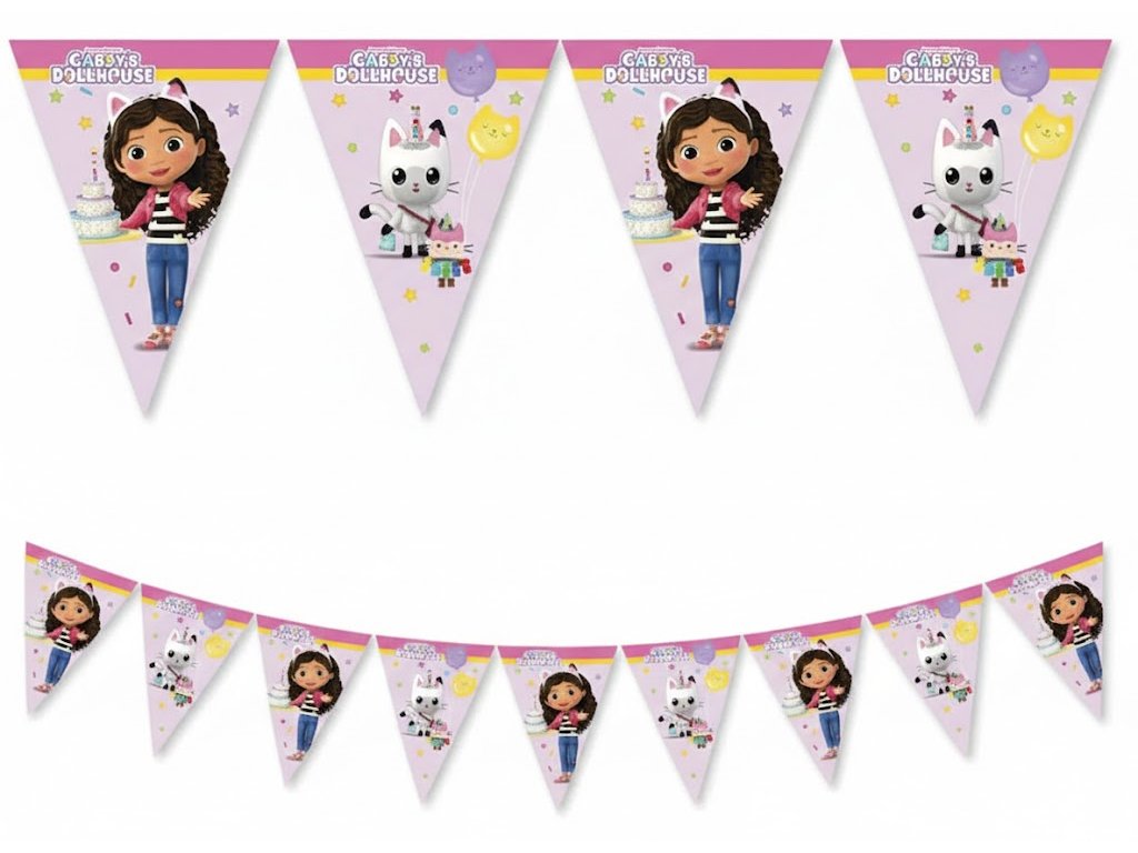 Proměňte dětský pokojíček v opravdový kouzelný domek s touto stylovou vlaječkovou girlandou. Na každé vlajce čeká Gábina a její nerozluční kočičí kamarádi – od Pandy Ťapky až po Dortěte. Je to ten nejrychlejší způsob, jak vytvořit parádní narozeninovou atmosféru, kterou si zamiluje každá malá fanynka tohoto hitu. Stačí zavěsit a párty může začít!