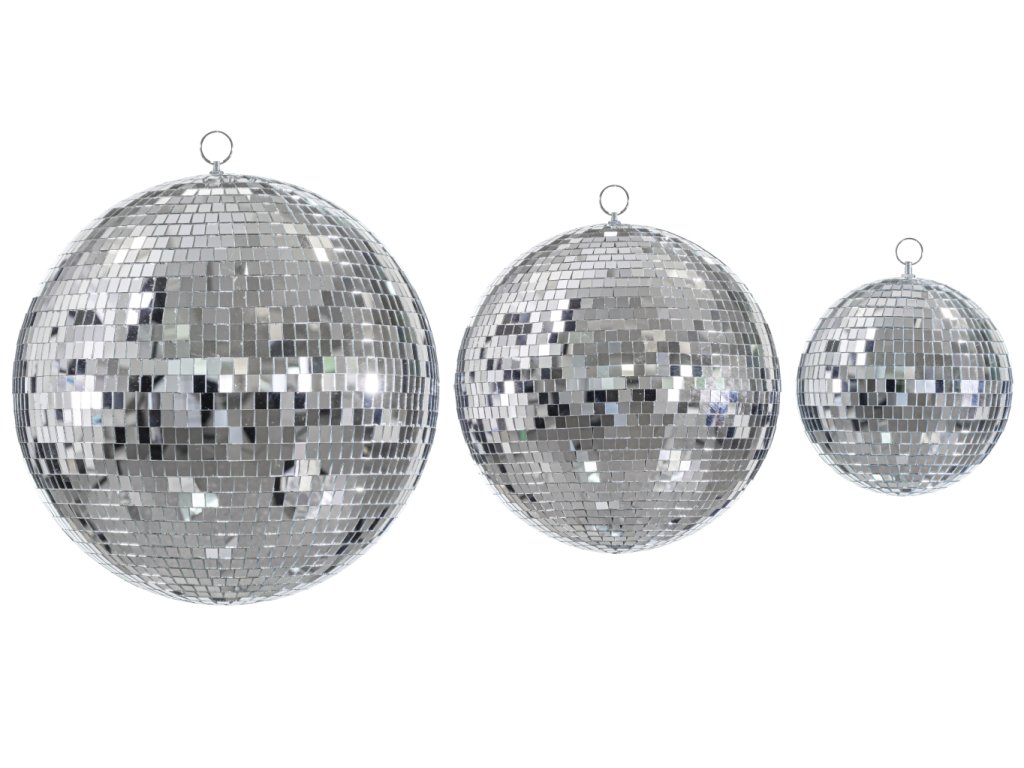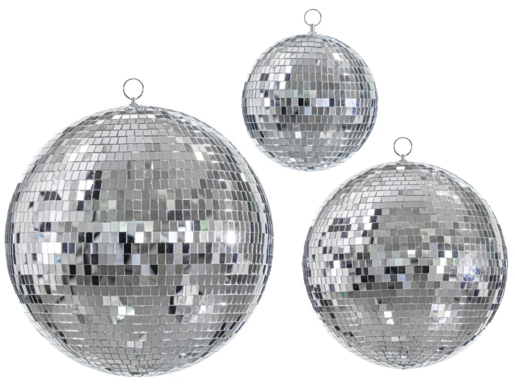Zrcadlové disco koule stříbrné o průměru 20, 30 a 40 cm s očky pro zavěšení. Zrcadlové koule slouží jako světelný efekt k vytvoření dynamické a třpytivé atmosféry na plesech, tanečních a hudebních akcích či firemních večírcích. Po nasvícení reflektorem odrážejí a rozptylují do prostoru světelné body, které díky otáčivému pohybu vytvářejí tančící světla na zdech a stropu. Koule jsou ideální pro vytvoření nezapomenutelné atmosféry.