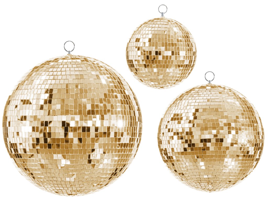 Zrcadlové disco koule zlaté o průměru 20, 30 a 40 cm s očky pro zavěšení. Zrcadlové koule slouží jako světelný efekt k vytvoření dynamické a třpytivé atmosféry na plesech, tanečních a hudebních akcích či firemních večírcích. Po nasvícení reflektorem odrážejí a rozptylují do prostoru světelné body, které díky otáčivému pohybu vytvářejí tančící světla na zdech a stropu. Koule jsou ideální pro vytvoření nezapomenutelné atmosféry.